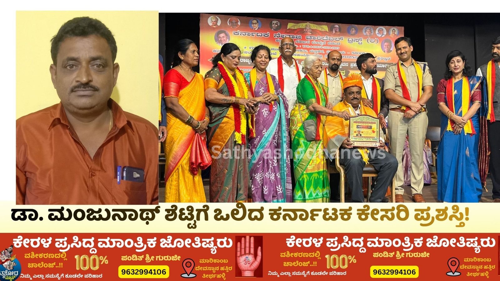 ನವೆಂಬರ್ 1 ರಂದು ಬೆಂಗಳೂರಿನ ರವೀಂದ್ರ ಕಲಾ ಕ್ಷೇತ್ರದಲ್ಲಿ ನಾಡಿನ ಹೆಸರಾಂತ ಸ್ವಾಮಿಜಿಗಳು ಹಾಗೂ ಸಾಹಿತಿಗಳು ಹಾಗೂ ವಿವಿಧ ಕ್ಷೇತ್ರದ ಬಹುಮುಖ ಗಣ್ಯರ ಅಮೃತಹಸ್ತದಿಂದ ಪ್ರಶಸ್ತಿಯನ್ನು ನೀಡಲಾಯಿತು.ತೀರ್ಥಹಳ್ಳಿಯ ಜನರ ವಿಶ್ವಾಸ ಪಡೆದ ಡಾ ಮಂಜುನಾಥ್ ಶೆಟ್ಟಿಯವರಿಗೆ ಪ್ರಶಸ್ತಿ ದೊರಕಿದ್ದು ಮಂಜುನಾಥ್ ಅವರ ಆಪ್ತ ಬಳಗ ಅಭಿನಂದನೆ ತಿಳಿಸಿದ್ದಾರೆ. ಇನ್ನಷ್ಟು ಹೆಚ್ಚು ಹೆಚ್ಚು ಪ್ರಶಸ್ತಿ ಪುರಸ್ಕಾರಗಳು ಅರಸಿ ಬರಲಿ ಎಂಬುದು ಸತ್ಯಶೋಧ ನ್ಯೂಸ್ ಮಾಧ್ಯಮದ ಆಶಾಯವಾಗಿದೆ.