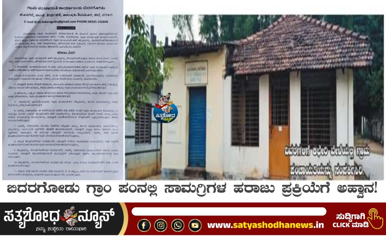 ಶಿವಮೊಗ್ಗ : ಜಿಲ್ಲೆಯ ತೀರ್ಥಹಳ್ಳಿ ತಾಲೂಕು ಹೊಸಗದ್ದೆಯ ಬಿದರಗೋಡು ಗ್ರಾಮ ಪಂಚಾಯಿತಿ ಹಳೆ ಕಟ್ಟಡ ವನ್ನು ನೆಲಸಮಗೊಳಿಸಿದ್ದು, ಅದರಲ್ಲಿ ಮರದ ಸಾಮಗ್ರಿಗಳು, ಕಲ್ಲು ಹಾಗೂ ಇತರೆ ಸಾಮಗ್ರಿಗಳನ್ನು ದಿ. 31 ರ ಸೋಮವಾರ ಬೆಳಿಗ್ಗೆ 11:30ಕ್ಕೆ ಬಿದರಗೋಡು ಕಾರ್ಯಲಯದಲ್ಲಿ ಬಹಿರಂಗ ಹರಾಜು ಮುಖಾಂತರ ನೀಡಲು ತೀರ್ಮಾನಿಸಿ ಹರಾಜು ಕರೆಯಲಾಗಿದೆ.ಆಸಕ್ತರು ಹರಾಜಿನಲ್ಲಿ ಭಾಗವಹಿಸಲು ಸತ್ಯಶೋಧ ಮಾಧ್ಯಮದ ಮೂಲಕ ಕೋರಲಾಗಿದೆ.