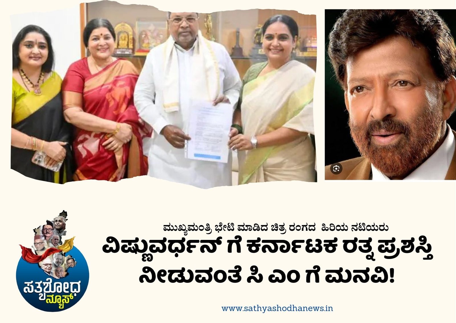 ಸತ್ಯಶೋಧ ನ್ಯೂಸ್ ಡೆಸ್ಕ್ :ಕನ್ನಡದ ಮೇರು ನಟರಲ್ಲಿ ಒಬ್ಬರಾದ ಸಾಹಸ ಸಿಂಹ ವಿಷ್ಣುವರ್ಧನ್ ರಿಗೆ ಕರ್ನಾಟಕ ರತ್ನ ಪ್ರಶಸ್ತಿ ನೀಡುವಂತೆ ಒತ್ತಾಯಿಸಲಾಗಿದೆ. ಇದೇ ವೇಳೆ ಸೆ 2 ರಂದು ಮುಖ್ಯಮಂತ್ರಿಯವರನ್ನು ಭೇಟಿ ಮಾಡಿದ ಸ್ಯಾಂಡಲ್ ವುಡ್ ಹಿರಿಯ ನಟಿಯರು ಭೇಟಿಯಾಗಿ. ನಟ ಡಾ.ವಿಷ್ಣುವರ್ಧನ್ ಗೆ ಕರ್ನಾಟಕ ರತ್ನ ಪ್ರಶಸ್ತಿಯನ್ನು ನೀಡುವಂತೆ ಮನವಿ ಮಾಡಲಾಗಿದೆ.