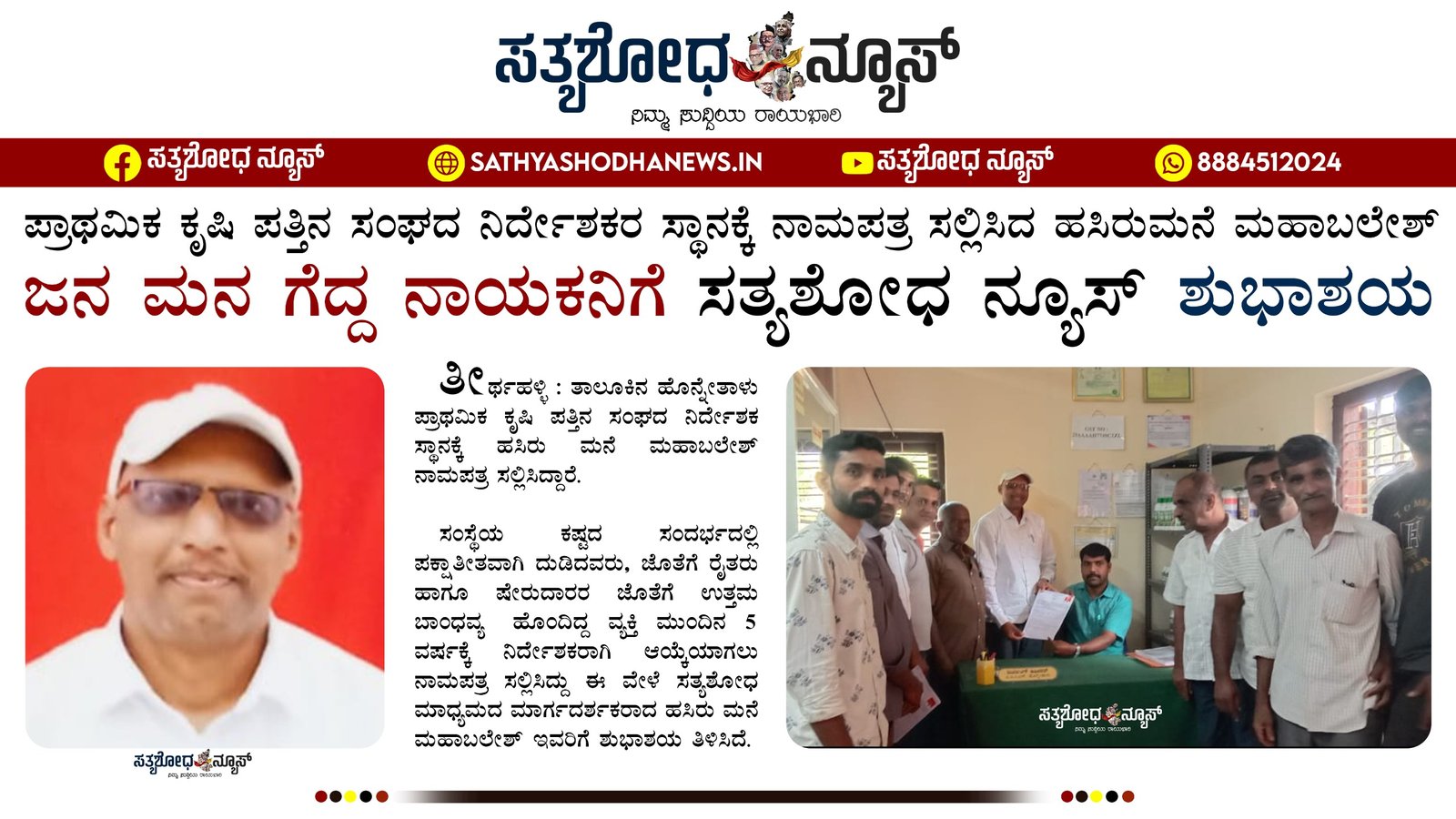 ಸಂಸ್ಥೆಯ ಕಷ್ಟದ ಸಂದರ್ಭದಲ್ಲಿ ಪಕ್ಷಾತೀತವಾಗಿ ದುಡಿದವರು, ಜೊತೆಗೆ ರೈತರು ಹಾಗೂ ಷೇರುದಾರರ ಜೊತೆಗೆ ಉತ್ತಮ ಬಾಂಧವ್ಯ ಹೊಂದಿದ್ದ ವ್ಯಕ್ತಿ ಮುಂದಿನ 5 ವರ್ಷಕ್ಕೆ ನಿರ್ದೇಶಕರಾಗಿ ಆಯ್ಕೆಯಾಗಲು ನಾಮಪತ್ರ ಸಲ್ಲಿಸಿದ್ದು ಈ ವೇಳೆ ಸತ್ಯಶೋಧ ಮಾಧ್ಯಮದ ಮಾರ್ಗದರ್ಶಕರಾದ ಹಸಿರು ಮನೆ ಮಹಾಬಲೇಶ್ ಇವರಿಗೆ ಶುಭಾಶಯ ತಿಳಿಸಿದೆ.