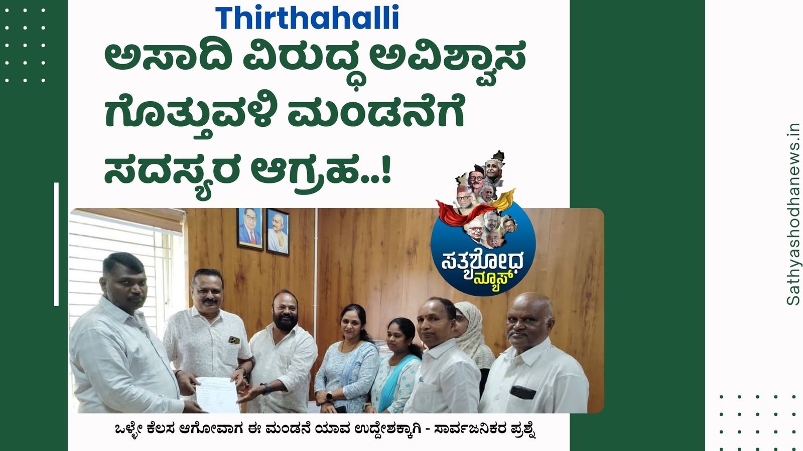 ತೀರ್ಥಹಳ್ಳಿ: ಪಟ್ಟಣ ಪಂಚಾಯ್ತಿ ಹಾಲಿ ಅಧ್ಯಕ್ಷರ ವಿರುದ್ಧ ಅವಿಶ್ವಾಸ ಗೊತ್ತುವಳಿ ಮಂಡಿಸುವ ವಿಷಯಕ್ಕೆ ಸಂಬಂಧಿಸಿದಂತೆ ಅಧ್ಯಕ್ಷರಾದ ರಹಮ ತ್ ಉಲ್ಲಾ ಅಸಾದಿ ವಿರುದ್ಧ ಪಟ್ಟಣ ಪಂಚಾಯತಿಯ ಆರು ಮಂದಿ ಸದಸ್ಯರು ವಿಶ್ವಾಸ ಇಲ್ಲದೇ ಇರುವ ಕಾರಣ ಅಸಾದಿ ವಿರುದ್ಧ ಅವಿಶ್ವಾಸ ಗೊತ್ತುವಳಿಯನ್ನು ಮಂಡಿಸುತ್ತಿದ್ದೇವೆ.