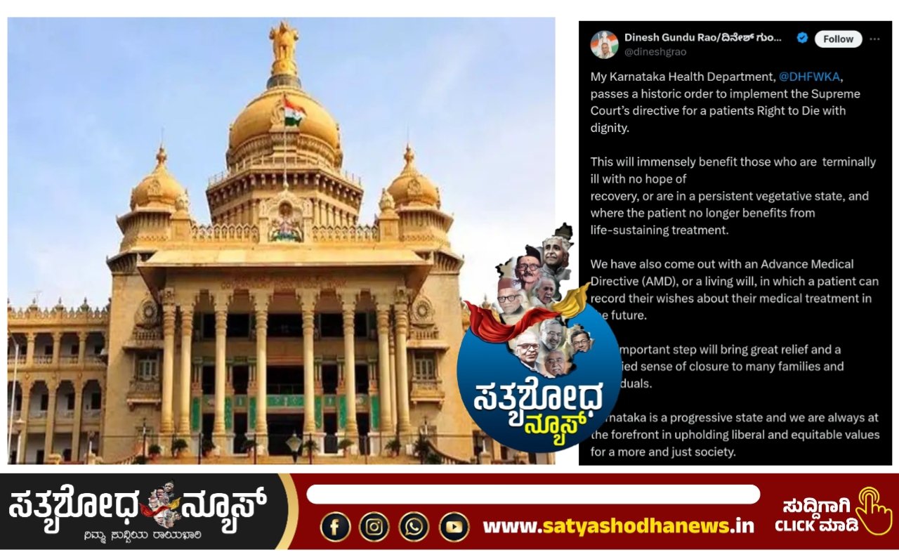 ಈಗ ಮಾರಕ ರೋಗದಿಂದ ಬಳಲುತ್ತಿರುವವರು ದಯಾಮರಣದ ಅವಕಾಶವನ್ನು ಕರ್ನಾಟಕದಲ್ಲಿ ನೀಡಲಾಗಿದೆ.ರೋಗಿಯು ಘನತೆಯಿಂದ ಸಾಯುವ ಹಕ್ಕಿನ ಬಗ್ಗೆ ಸುಪ್ರೀಂ ಕೋರ್ಟ್ ನೀಡಿರುವ ನಿರ್ದೇಶನವನ್ನು ಅನುಷ್ಠಾನಗೊಳಿಸಲು ರಾಜ್ಯ ಆರೋಗ್ಯ ಇಲಾಖೆ ಐತಿಹಾಸಿಕ ಆದೇಶ ಹೊರಡಿಸಿದೆ ಎಂದು ಆರೋಗ್ಯ ಸಚಿವ ದಿನೇಶ್ ಗುಂಡೂರಾವ್ ಶುಕ್ರವಾರ ಪ್ರಕಟಿಸಿದ್ದಾರೆ.