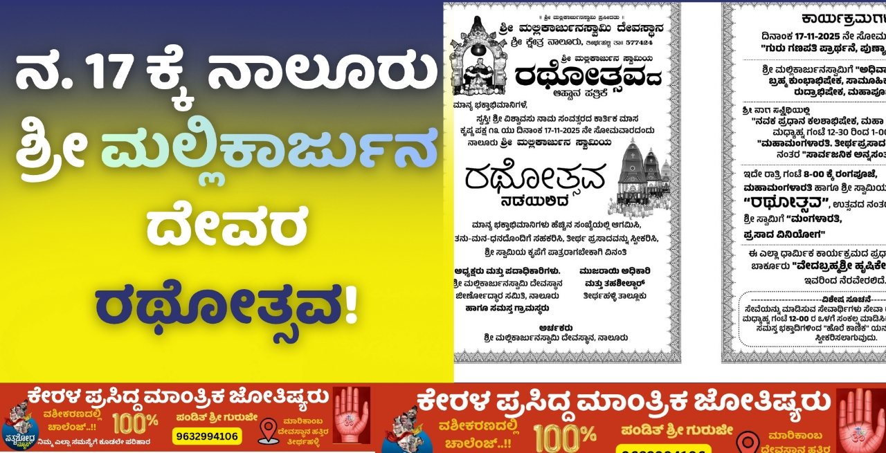 ತೀರ್ಥಹಳ್ಳಿ : ತಾಲೂಕಿನ ಆಗುಂಬೆ ಹೋಬಳಿ ನಾಲೂರು ಶ್ರೀ ಮಲ್ಲಿಕಾರ್ಜುನ ಸ್ವಾಮಿಯ ರಥೋತ್ಸವವನ್ನು ನ. 17 ರ ಸೋಮವಾರ ಜರುಗಲಿದ್ದು, ಮಾನ್ಯ ಭಕ್ತಾದಿಗಳು ಹೆಚ್ಚಿನ ಸಂಖ್ಯೆಯಲ್ಲಿ ಭಾಗವಹಿಸಿ ತನು ಮನ ಧನ ದೊಂದಿಗೆ ಸಹಕರಿಸಿ ದೇವರ ಕೃಪೆಗೆ ಪಾತ್ರರಾಗಲು ಈ ಮೂಲಕ ಮಲ್ಲಿಕಾರ್ಜುನ ದೇವಸ್ಥಾನ ಜೀರ್ಣೊದ್ಧಾರ ಸಮಿತಿ ಆಹ್ವಾನಿಸಿದೆ.