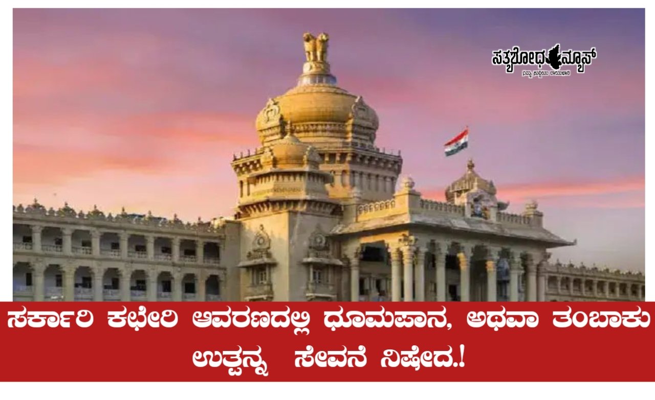 ರಾಜ್ಯ ಸರ್ಕಾರದಿಂದ ಸರ್ಕಾರಿ ಕಚೇರಿಗಳಲ್ಲಿ, ಕಚೇರಿಯ ಆವರಣಗಳಲ್ಲಿ ಧೂಮಪಾನ, ಇತರೆ ತಂಬಾಕು ಉತ್ಪನ್ನಗಳ ಸೇವನೆಯನ್ನು ನಿಷೇಧಿಸಿ ಖಡಕ್ ಆದೇಶ ಹೊರಡಿಸಲಾಗಿದೆ.