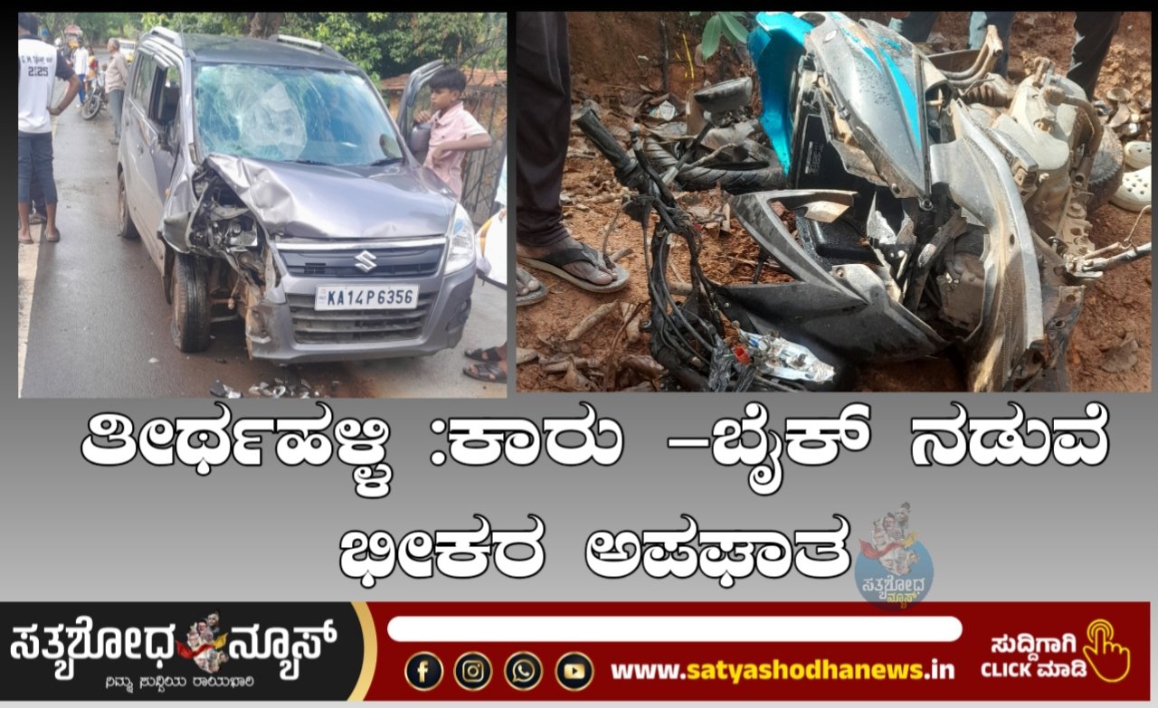 ತೀರ್ಥಹಳ್ಳಿ ತಾಲೂಕಿನ ಬಿಳಲುಕೊಪ್ಪ ಶಾಲೆಯ ಎದುರು ವ್ಯಾಗನಾರ್ ಕಾರು ಹಾಗೂ ಬೈಕ್ ನಡುವೆ ಮುಖಾಮುಖಿ ಡಿಕ್ಕಿಯಾಗಿದ್ದು,ಬೈಕ್ ಸವಾರ ಸಾವನಪ್ಪಿರುವ ಘಟನೆ ನಡೆದಿದೆ ಸ್ಥಳೀಯರು ಕೂಡಲೇ ಮಣಿಪಾಲ್ ಆಸ್ಪತ್ರೆಗೆ ರವಾನೆ ಮಾಡಲಾಗಿದ್ದು ಆಸ್ಪತ್ರೆಗೆ ಹೋಗುವ ಮಾರ್ಗ ಮದ್ಯೆ ಕೊನೆಯುಸಿರಿಳೆದ್ದಾನೆ ನಡೆದ ಸ್ಥಳಕ್ಕೆ ಪೊಲೀಸರು ಭೇಟಿ ನೀಡಿ ಸ್ಥಳ ಮಾಜರು ಮಾಡಿದ್ದಾರೆ.ಸಧ್ಯ ಬೈಕ್ ಸವಾರ ಹುಂಚದ ಕಟ್ಟೆ ಕೈಮರದ ಚೇತನ್ ಎಂದು ಗುರುತಿಸಲಾಗಿದೆ.