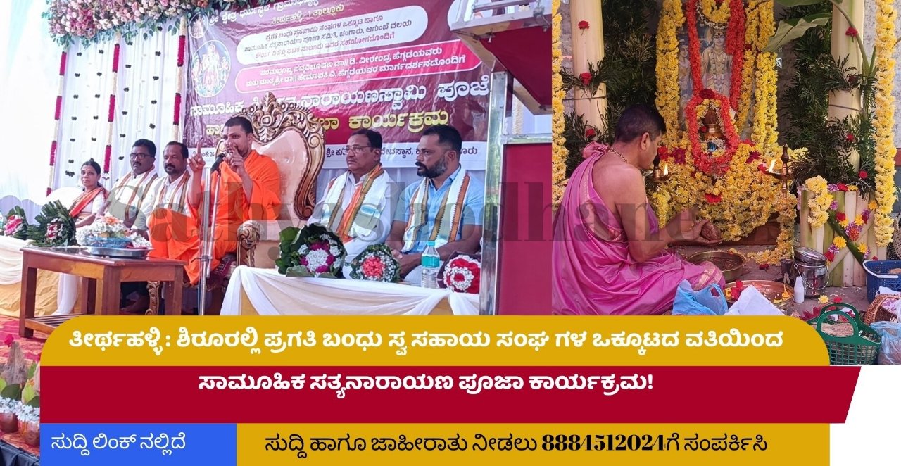 ತೀರ್ಥಹಳ್ಳಿ : ಪರಮಪೂಜ್ಯ ಪದ್ಮವಿಭೂಷಣ ಡಾ|| ಡಿ. ವೀರೇಂದ್ರ ಹೆಗ್ಗಡೆಯವರು ಹಾಗೂ ಮಾತೃಶ್ರೀ ಡಾ || ಹೇಮಾವತಿ ವಿ ಹೆಗ್ಗಡೆ ಯವರ ಮಾರ್ಗದರ್ಶನದೊಂದಿಗೆ ಶ್ರೀ ಕ್ಷೇತ್ರ ಧರ್ಮಸ್ಥಳ ಗ್ರಾಮಾಭಿವೃದ್ಧಿ ಯೋಜನೆ ತೀರ್ಥಹಳ್ಳಿ -1 ರ ಪ್ರಗತಿ ಬಂಧು ಸ್ವಸಹಾಯ ಸಂಘಗಳ ಒಕ್ಕೂಟ ಹಾಗೂ ಸಾಮೂಹಿಕ ಸತ್ಯನಾರಾಯಣ ಪೂಜಾ ಸಮಿತಿ, ಚಂಗಾರು ಆಗುಂಬೆ ವಲಯ ಶೌರ್ಯ ವಿಪತ್ತು ಘಟಕ ನಾಲೂರು ಇವರ ಸಹಯೋಗದೊಂದಿಗೆ ಸಾಮೂಹಿಕ ಸತ್ಯನಾರಾಯಣ ಪೂಜೆ ಹಾಗೂ ಧಾರ್ಮಿಕ ಸಭೆ
