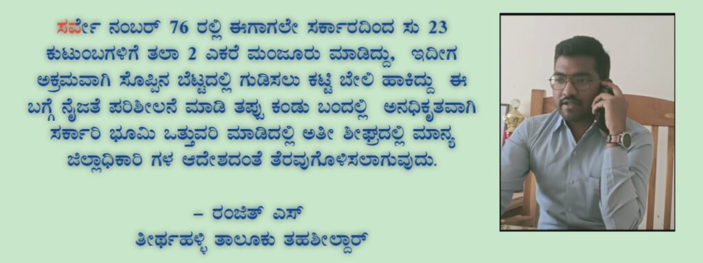 ತೀರ್ಥಹಳ್ಳಿ : ತಾಲೂಕಿನ ಆಗುಂಬೆ ಹೋಬಳಿ ಶಿರೂರು ಗ್ರಾಮದ ಜಾವಗಲ್ – ಕಡ್ಲಿಯಲ್ಲಿ ಸು 44 ಕುಟುಂಬಗಳು ವಾಸಿಸುತ್ತಿದ್ದು, ಸದರಿ ಕುಟುಂಬಗಳು ರೈತರಾಗಿದ್ದು ವ್ಯವಸಾಯ ವೃತ್ತಿಯನ್ನು ಅವಲಂಬಿಸಿ ಜೀವನ ಸಾಗಿಸುತ್ತಿದ್ದಾರೆ. ಜೊತೆಗೆ ಇಲ್ಲಿ ವಾಸವಾಗಿರುವವರ ಪೈಕಿ ನಾಲ್ಕು ಕುಟುಂಬವು ಪರಿಶಿಷ್ಟ ಜಾತಿಗೆ ಸೇರಿದ ಕುಟುಂಬವಿದ್ದು ಯಾವುದೇ ವ್ಯಾಜ್ಯ ಇರದೇ, ಮೇಲು ಕೀಳು ಎಂಬ ಭಾವನೆ ಇಲ್ಲದೆ ಜೀವನ ಸಾಗಿಸುತ್ತಿದ್ದು,ಈ ವಿಷಯ ಒಂದೆಡೆಯಾದರೆ 1982-83 ನೇ ಸಾಲಿನಲ್ಲಿ ಕರ್ನಾಟಕ ಸರ್ಕಾರವು ಸು 23 ಕುಟುಂಬಗಳಿಗೆ ತಲಾ 2 ಎಕರೆ ಯಂತೆ ಶಿರೂರು ಗ್ರಾಮದ ಸರ್ವೇ ನಂ 76 ರ ಮಾಲತಿ ನದಿ ತೀರದಲ್ಲಿ ದರಖಾಸ್ತು ರೂಪದಲ್ಲಿ ಮಂಜೂರು ಮಾಡಿದ್ದು ಇದರಲ್ಲಿ ಶಿರೂರು ಗ್ರಾಮದ ಪಡುವಳ್ಳಿ ವಾಸಿ ಸಣ್ಣಪ್ಪ ಇವರಿಗೂ 2ಎಕರೆ ಮಂಜೂರಾತಿಯಾಗಿರುತ್ತದೆ.