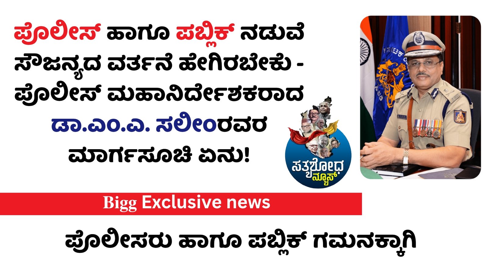 ಸಮಾಜದಲ್ಲಿ ಪೊಲೀಸ್ ಇಲಾಖೆಯ ಬಗ್ಗೆ ಉತ್ತಮ ಅಭಿಪ್ರಾಯವನ್ನು ಮೂಡಿಸಲು, ಪೊಲೀಸ್ ಅಧಿಕಾರಿ / ಸಿಬ್ಬಂದಿಯವರುಗಳು ಕರ್ತವ್ಯ ನಿರ್ವಹಿಸುವಾಗ ಪಾರದರ್ಶಕತೆ, ಸೌಜನ್ಯದ ವರ್ತನೆ ಮತ್ತು ನಿಷ್ಠೆಯನ್ನು ಕಾಯ್ದುಕೊಳ್ಳುವ ಬಗ್ಗೆ ಪೊಲೀಸ್ ಮಹಾನಿರ್ದೇಶಕರಾದ ಡಾ.ಎಂ.ಎ. ಸಲೀಂ ಅವರು ತಮ್ಮ ಅಧೀನದ ಅಧಿಕಾರಿಗಳಿಗೆ ಮಾರ್ಗಸೂಚಿಯನ್ನು ಬಿಡುಗಡೆ ಮಾಡಿದ್ದಾರೆ.